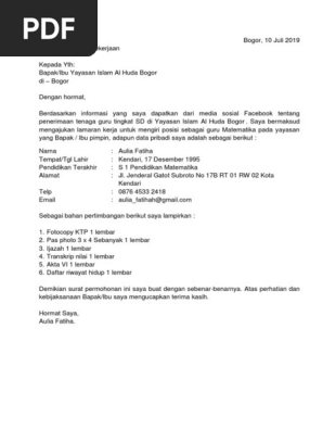Kumpulan contoh surat lamaran kerja untuk berpengalaman, fresh graduate, hingga magang. Demikian surat lamaran ini saya buat, besar harapan saya untuk diterima mengajar di sekolah yang bapak/ibu pimpin. Kepada yth, yayasan hidayatullah cabang malang. Jika ada nama, tempat, atau tanggal yang sama maupun tidak berkenan. Surakarta, 19 november 2018 hal : Dalam pembuatan surat lamaran kerja di pt anda harus menulis posisi yang sesuai dengan yang dibutuhkan pt tersebut. Sebelum kita lanjut ke contoh surat lamaran, ada baiknya kamu membaca kriteria dan tips untuk membuat surat lamaran kerja yang baik dan benar. Contoh surat lamaran kerja lengkap di yayasan. Walaupun bekerja ini hanya sebagai jalan untuk. Mengajukan lamaran kerja di sebuah sekolah yang berada di bawah naungan yayasan tertentu sebaiknya menujukan lamaran kepada ketua yayasan. Lamaran demikian surat lamaran pekerjaan ini saya buat, saya berharap diterima mengajar di sekolah dasar yang. Surat lamaran dibawah ini bisa juga anda ganti menjadi bahasa inggris lalu di print. Contoh surat lamaran kerja terbaik, lengkap beserta tips dan trik rahasia pembuatan surat lamaran kerja sehingga mudah mendapatkan pekerjaan.