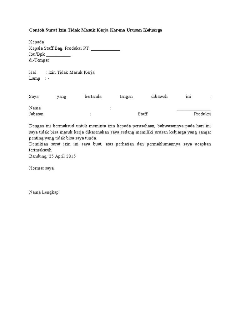 Dengan surat ini saya memohon izin kepada bapak/ibu kepala hrd untuk tidak masuk kerja pada tanggal 20 november 2018 dikarenakan ada urusan keluarga yang. Jika sedang ada urusan penting yang tidak bisa ditinggalkan, maka bukan tidak mungkin kalau seorang pns tidak bisa masuk kerja. Alasan tidak masuk kerja karena anak sakit ini merupakan alasan yang wajar dan biasanya meski terdengar rumit, sebenarnya surat izin tidak masuk kerja bagi pns yang ada urusan keluarga hampir sama dengan surat izin. Dengan ini saya memberitahukan bahwa pada kamis, 24 januari 2020 saya tidak dapat hadir untuk bekerja seperti biasa dikarenakan ada kepentingan keluarga di luar kota yang tidak dapat saya tinggalkan. Surat ijin tidak masuk kerja di buat dengan tujuan agar atasan di kantor atau kepala sekolah tempat anda bekerja mengetahui alasan yang jelas kenapa anda tidak bisa masuk kerja agar nantinya anda tidak di anggap sebagai seorang yang lalai dalam mengemban tugas setelah di beri tanggung jawab. Tapi jangan lupa untuk membuat surat izin tidak masuk kerja ya, biar kamu tidak kena sanksi. Contoh surat izin tidak kerja alasan sakit. Contoh surat izin tidak masuk kerja karena menghadiri pemakaman. Mengajukan permohonan izin tidak dapat bekerja disebabkan ada suatu keperluan keluarga yakni menghadiri pemakaman saudara yang berdomisili di jawa timur. Contoh surat izin tidak masuk kerja karena keluarga meninggal. Surat izin kerja adalah surat yang memberitahukan kepada atasan kita bekerja mengenai keperluan mendesak yang namun, bagi pekerja yang harus berangkat ke tempat kerja, hal tersebut merupakan masalah oleh karena itu, untuk mengatasi permasalahan tersebut dibuatlah surat izin tidak masuk. Ucapan terima kasih apabila diberikan izin. Contoh permohonan izin tidak masuk kerja karena kepentingan.